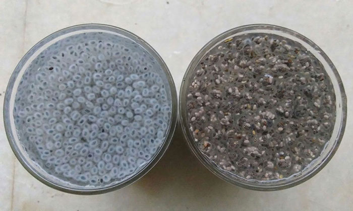 4- هر دو دانه بعد از خیساندن در آب بزرگ شده و به شکل ژله ای تغییر می کنند، دانه چیا تا 10 بار بیشتر از وزن خود آب جذب می کند در حالی که تخم شربتی یک لایه موسیلاژی بی رنگ در اطراف خود ایجاد کرده و بزرگ می شود. اندازه تخم شربتی بعد از جذب آب بزرگ تر از دانه های چیا خواهد بود.
